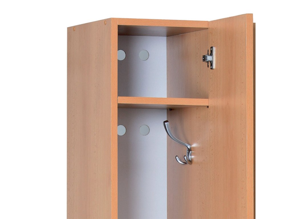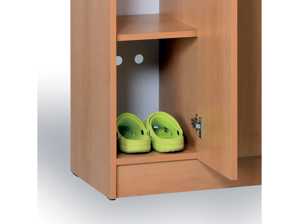 Celodřevěná šatní skříňka vnáší do prostoru příjemný a reprezentativní vzhled. Oproti kovovým skříňkám lépe zapadne do interiérů a zaměstnaneckých zázemí, kde hraje svou roli nejen funkčnost, ale i estetika. Skříňka je vyrobena z laminované dřevotřísky (18 mm), která je olepena po celém obvodu 1 mm ABS hranou. Povrch skříňky je snadno omyvatelný.
