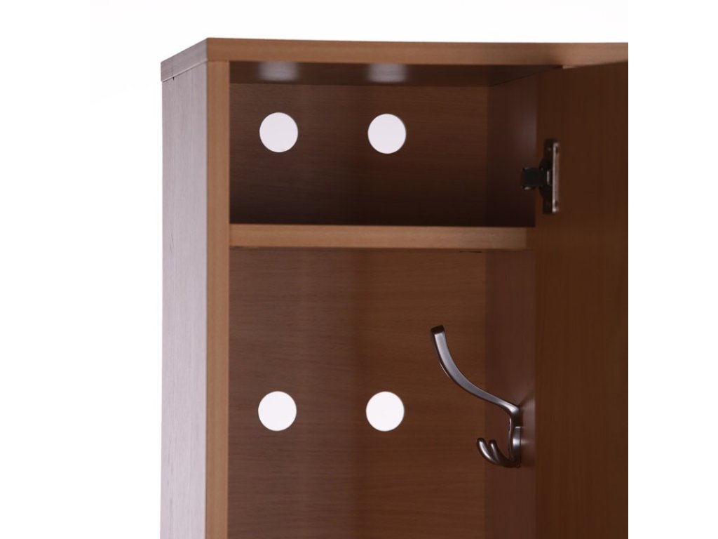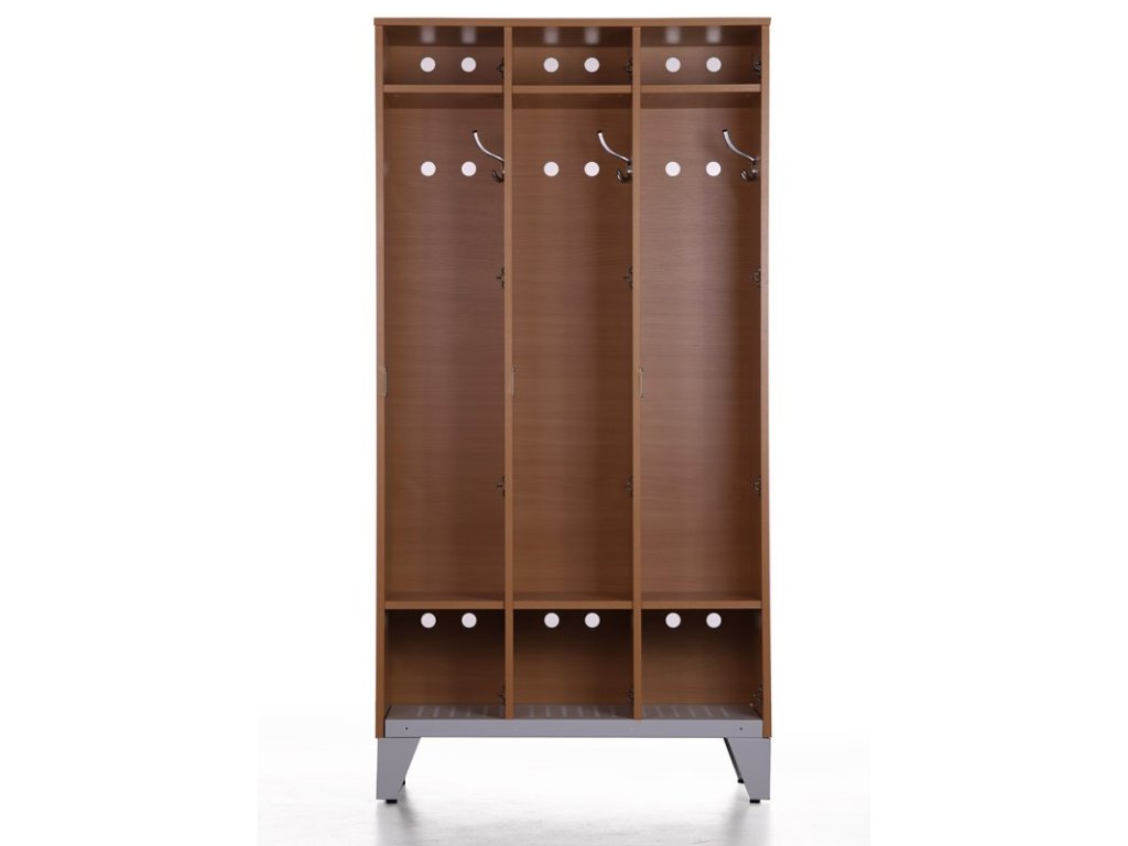 Školní dřevěná šatní skříň na nožkách pochází z naší vlastní produkce. Jedná se tak o ryze český výrobek, jehož podobu jsme sami navrhli. Zaměřili jsme se především na funkčnost a bezpečnost. Hrany jsou proto olepeny ABS plastovou hranou a zámek má kovové opláštění, které je zároveň vytvarováno jako madlo. Skříni nechybí vetilace, která je prvotně zajištěna otvory v zadní stěně a druhotně také pomocí perforovaného dna, jež zároveň slouží pro odvádění případných nečistot.