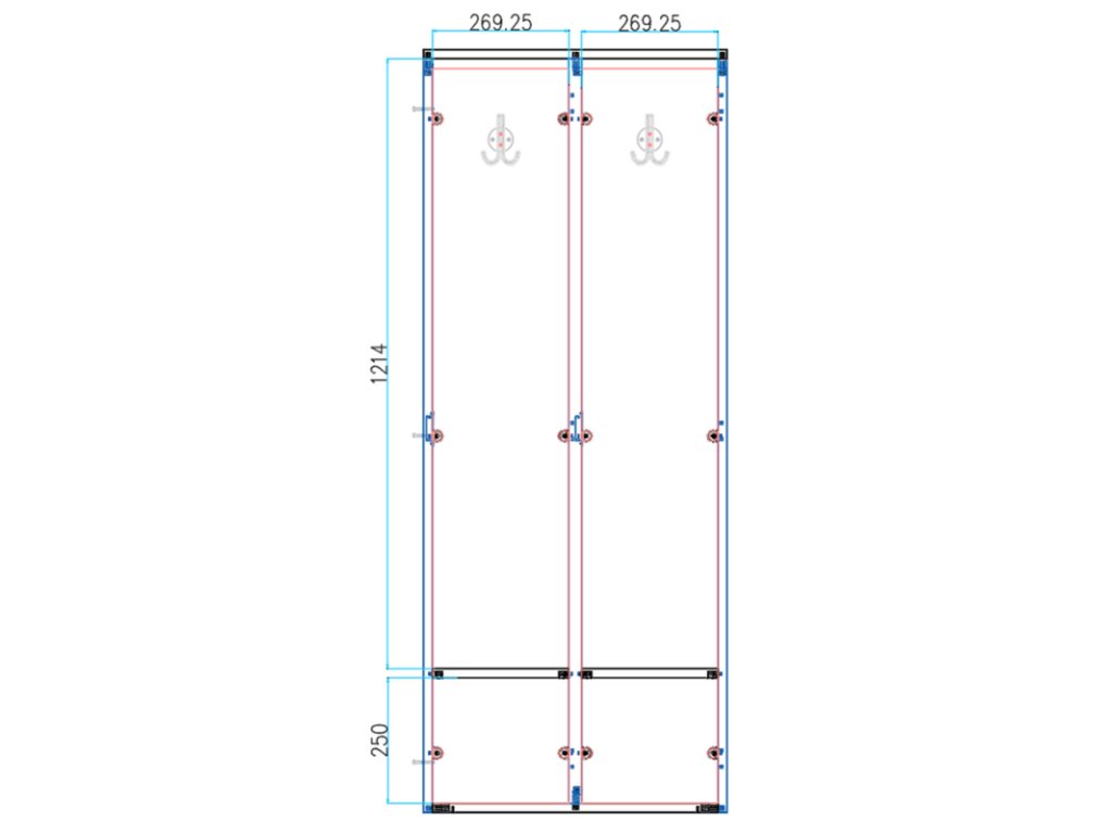 - 2 oddíly, šířka oddílu 300 mm, výška oddílu 1500 mm, lavička výšky 373 mm