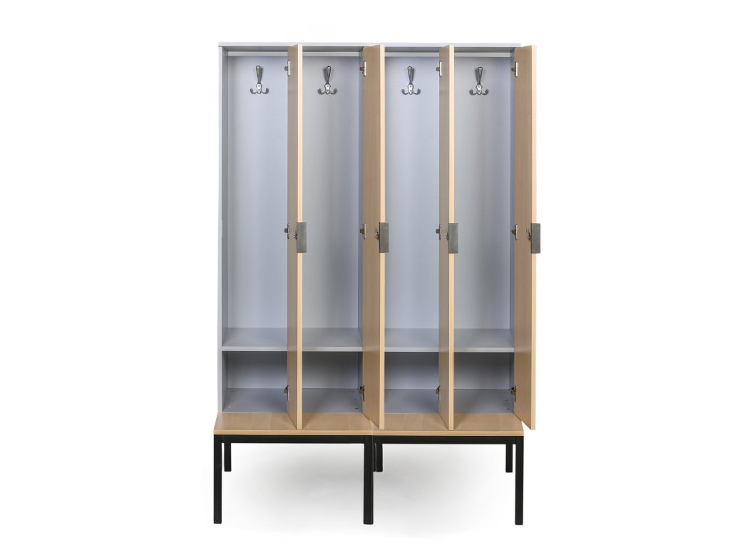Základnu tvoří kovová lavička vysoká 373 mm s laminovaným sedákem (hloubka 300 mm). Umožňuje pohodlné sezení i převlékání přímo u skříňky a šetří místo, které by jinak zabrala samostatná lavice.