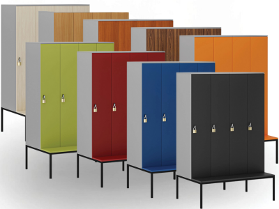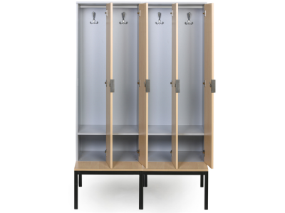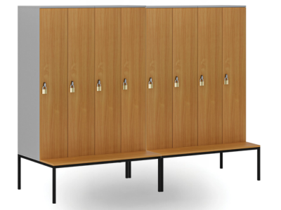 Základnu tvoří kovová lavička vysoká 373 mm s laminovaným sedákem (hloubka 300 mm). Umožňuje pohodlné sezení i převlékání přímo u skříňky a šetří místo, které by jinak zabrala samostatná lavice.