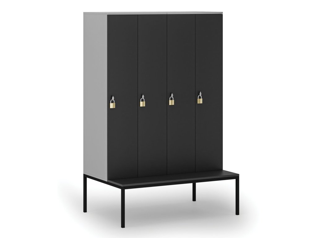 Dřevěná šatní skříňka S4 s lavičkou, 4 oddíly, 1871 x 1200 x 500/800 mm, demont, otočný zámek, šedá/grafit