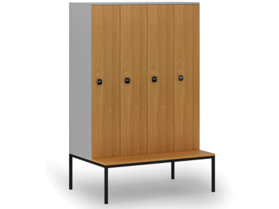 Dřevěná šatní skříňka S4 s lavičkou, 4 oddíly, 1871 x 1200 x 500/800 mm, demont, RFID zámek, šedá/bříza