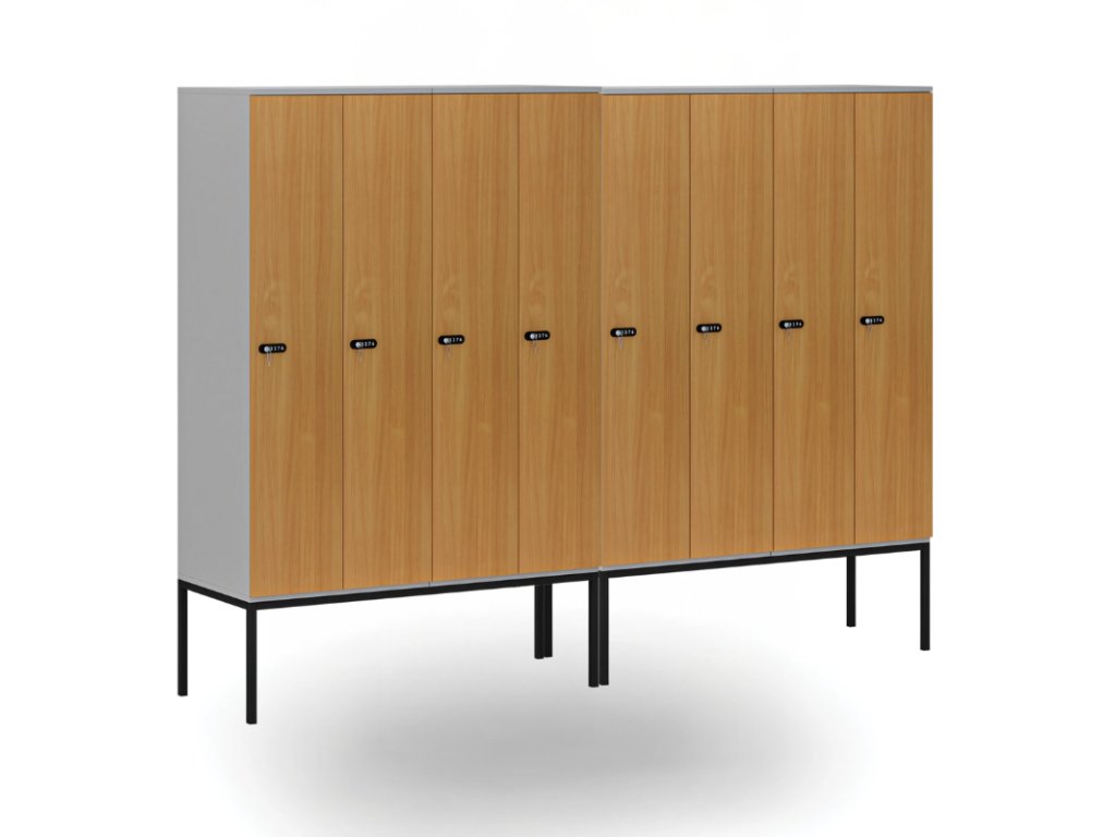 Dřevěná šatní skříňka S4 s podnoží, 4 oddíly, 1871 x 1200 x 500 mm, demont, mechanický kódový zámek, šedá/ořech