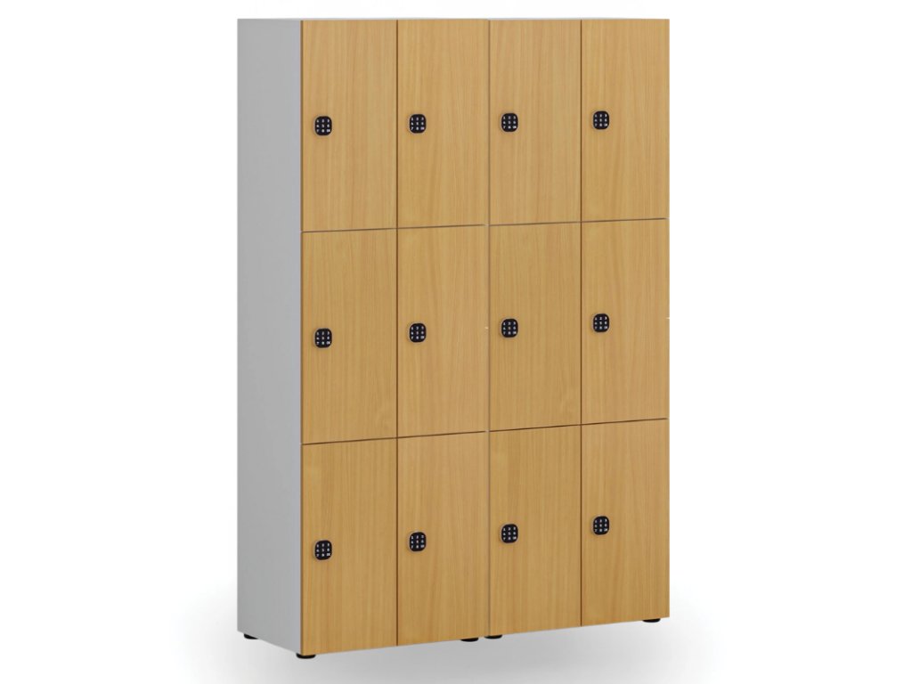 Dřevěná šatní skříňka S4 s úložnými boxy, 6 boxů, demont, kódový zámek, šedá/ořech