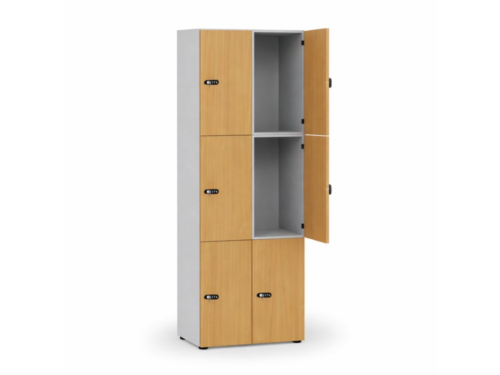 Skříňku s šířkou 300 mm tvoří 6 uzamykatelných boxů. Každý box poskytuje dostatek místa pro uložení osobních věcí, batohů či tašek. Toto úsporné a přitom bezpečné, uzamykatelné řešení je ideální všude tam, kde je potřeba šetřit místem a zároveň není nutné zavěšovat delší oděvy.