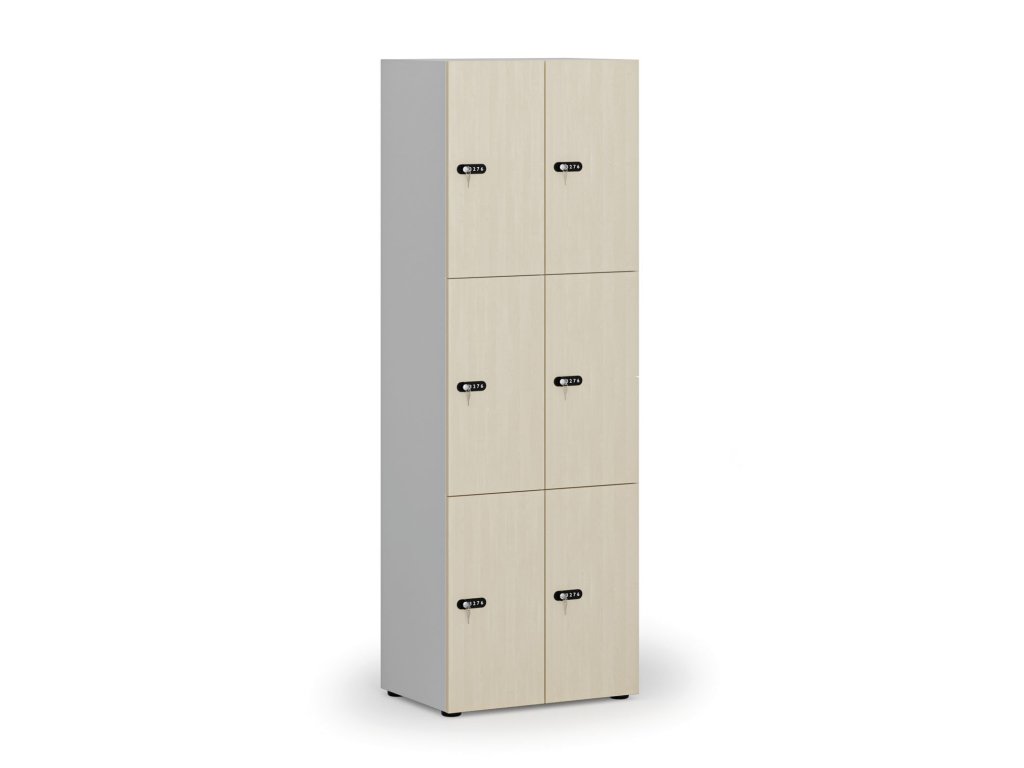 Dřevěná šatní skříňka S4 s úložnými boxy, 6 boxů, demont, mechanický kódový zámek, šedá/bříza