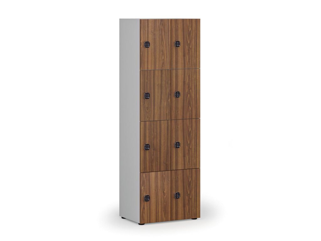 Dřevěná šatní skříňka S4 s úložnými boxy, 8 boxů, demont, kódový zámek, šedá/ořech