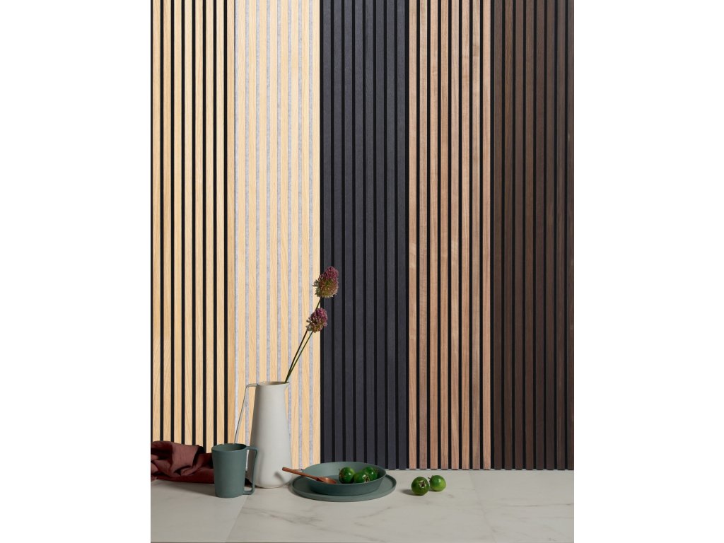 Aby akustické panely skvěle zapadly do moderních interiérů, ve kterých je kladen důraz na design a estetiku, je 9 mm hrubý polyesterový panel obložen 27 mm širokými a 12 mm hrubými MDF lamelami a rozestup mezi nimi činí 13 mm.