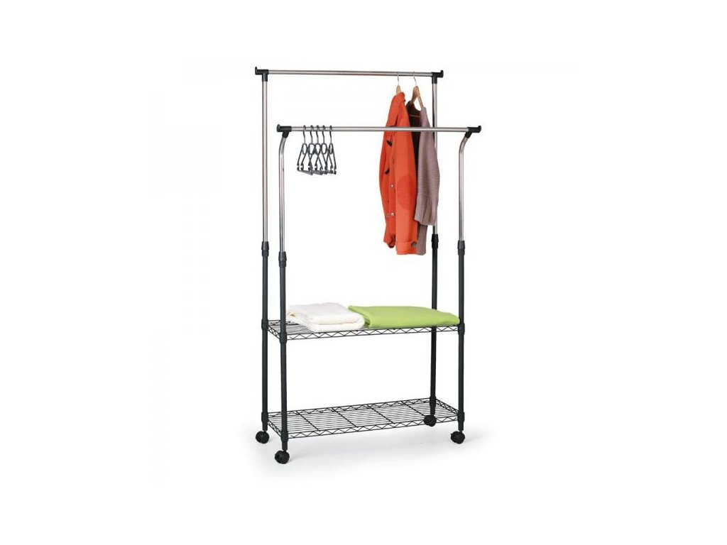 Dvojitý chromovaný věšák s vytahovacími rameny na šaty či kabáty. Věšák je výškově nastavitelný, je na kolečkách což umožňuje snadné přemisťování. Vhodný do vaši ložnice, nebo dětského pokoje ale i do kanceláře. Výborný pomocník při odkládání vašeho oblečení, které můžete položit na dvě spodní police. Lehká konstrukce a jednoduché sestavení. Seřiditelné ramena Vám dovolí věšet libovolné oděvy.