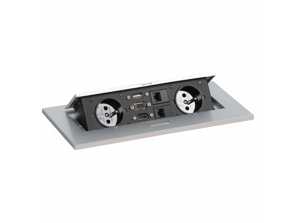 Výklopná zásuvková lišta TYP VI integrovaná ve stole je vyrobena ze slitiny zinku a železa. Obsahuje dvě elektrické zásuvky (francouzský typ), datový USB 2.0 port a dva síťové konektory RJ-45 (cat5E) pro snadné připojení a nabíjení zařízení přímo na pracovní ploše stolu. Pro pohodlný přenos obrazu pak nabízí VGA a HDMI porty. Dostupná ve stříbrné / černé barvě nabízí elegantní skryté řešení nejen pro kanceláře, konferenční místnosti, ale i knihovny a studovny. Stupeň krytí je IP10.