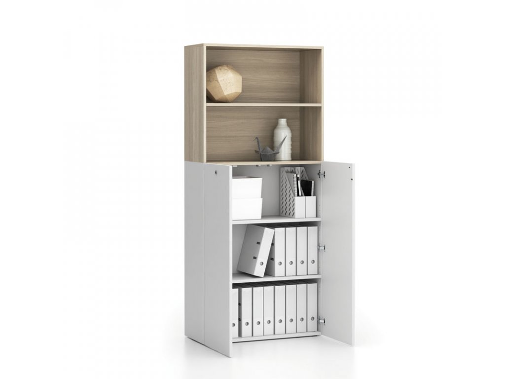 Kancelářská policová skříň 2-dveřová SEGMENT, uzamykatelná, 4 police, 840 x 370 x 1880 mm, bílá / dub přírodní