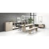 Úložný prostor je řešen buď otevřenými regály s kovovou výztuhou, které svým pevným rozměrem umožňují komfortní ukládání šanonů, a nebo uzavíratelnými skříňkami, ve kterých si můžete schovat nejen pracovní věci, ale i oděv. Skříňku si můžete zvolit s policemi a nebo s šatní tyčí. U skříněk je navíc možné libovolné přestavení polic dle Vašich preferencí. Mezi další praktické řešení úložného prostoru v kancelářích patří kontejnery, které skvěle doplní prostor pod pracovním stolem. Zásuvky jsou vybaveny kuličkovým pojezdem s dotahem. Praktická je také nízká skříňka, která může posloužit i jako botník. Hrany deskových prvků jsou olepeny ABS hranou 2 mm. Kovová madla skříněk a kontejnerů jsou z leštěného hliníku.