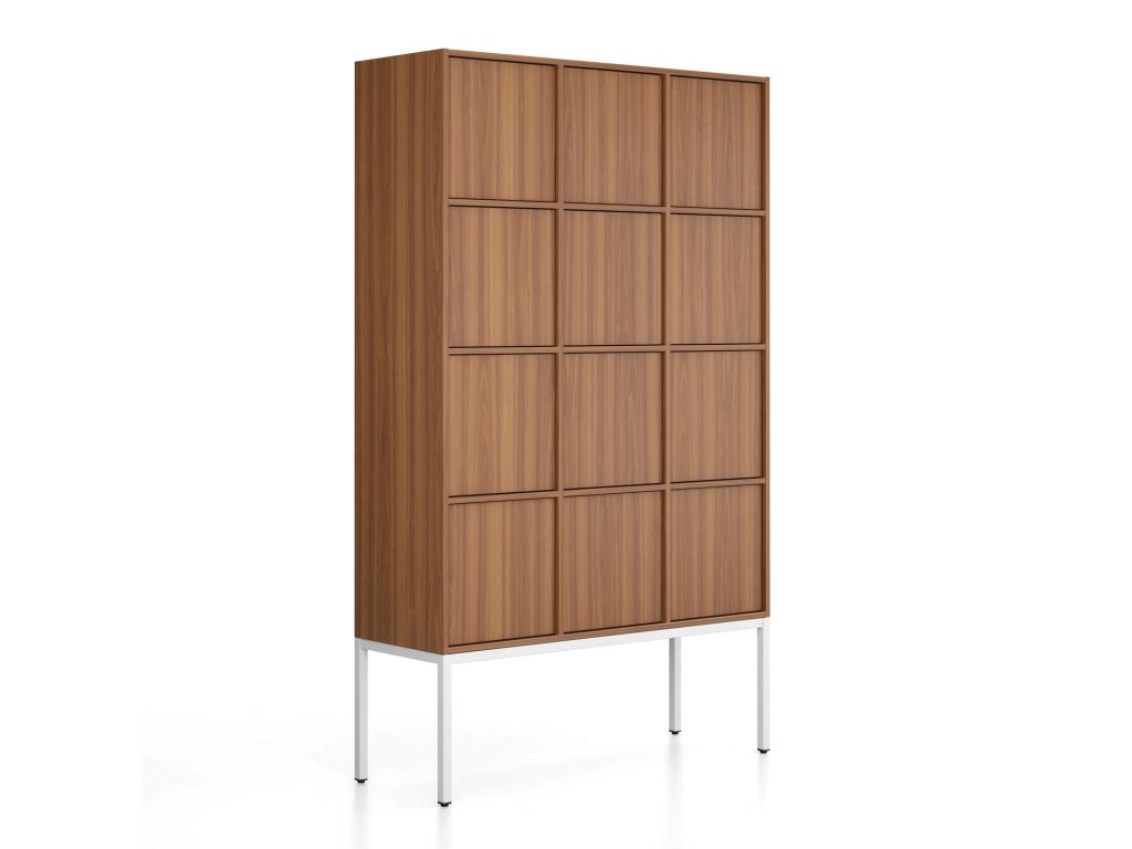 Kancelářská skříň FRAME, bílá podnož, 12x dveře, 1299 x 450 x 2185 mm, PUSH-lock, ořech