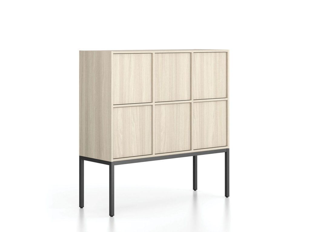 Nízké skříňky a regály FRAME o výšce dřevěné části 881 mm nabízejí 6 přehledně rozdělených boxů pro dokumenty, šanony i osobní věci. Police z laminované dřevotřísky o síle 18 mm s ABS hranou v barvě dezénu jsou pevně spojeny s korpusem, což zajišťuje vysokou stabilitu a odolnost při každodenním používání. Každá police unese až 30 kg při rovnoměrném zatížení a vnitřní rozměr jednoho boxu činí 409 × 409 mm.