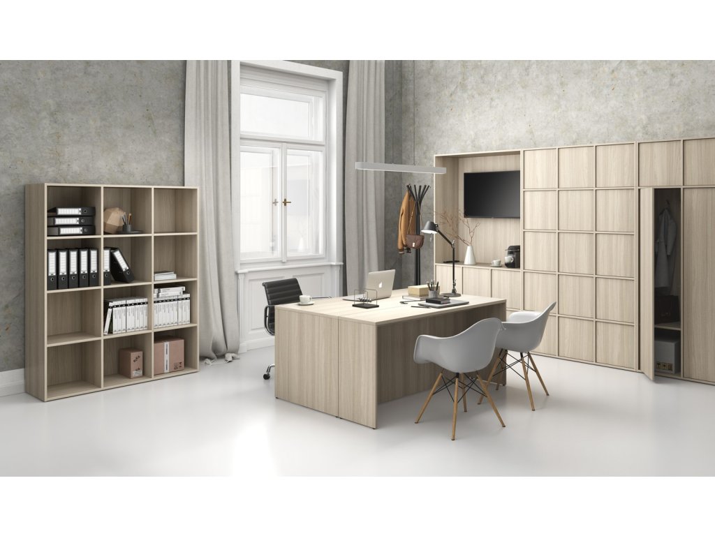 Při návrhu kolekce FRAME jsme mysleli i na možnost umístění veškerého nábytku volně do prostoru. Stoly, regály i skříně proto mají pohledová záda v barvě dezénu, takže je můžete postavit nejen ke stěně, ale i doprostřed. Skvěle tak poslouží i jako elegantní rozdělovač místnosti, který nepůsobí rušivě, a přitom zachovává čisté linie i reprezentativní vzhled celé kanceláře.