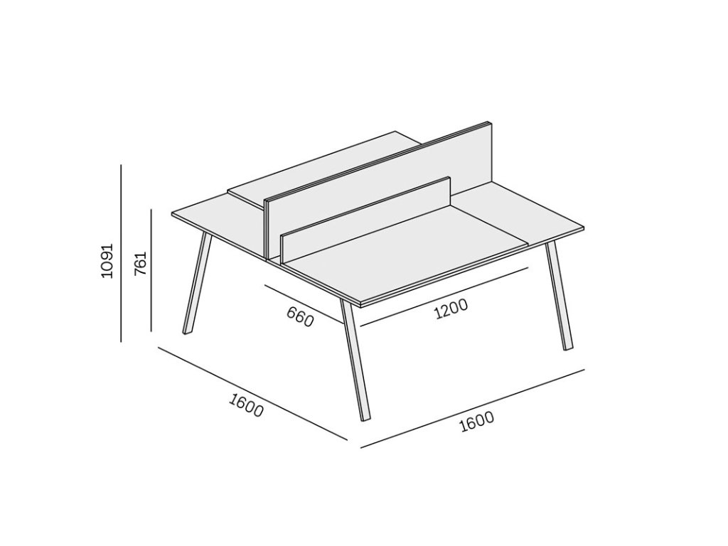 Psací stoly DOUBLE LAYERS disponují šířkou 1600 mm a hloubkou 1600 mm, která zajišťuje optimální podmínky pro celodenní práci v kanceláři pro dva kolegy. Poskytuje oboum pracovníkům dostatek místa pro PC i kancelářské potřeby. Pracovní deska z laminované dřevotřísky je olepena 1 mm silnou ABS hranou ve stejném dekoru, což dodává celé stolní desce jednotný vzhled.
