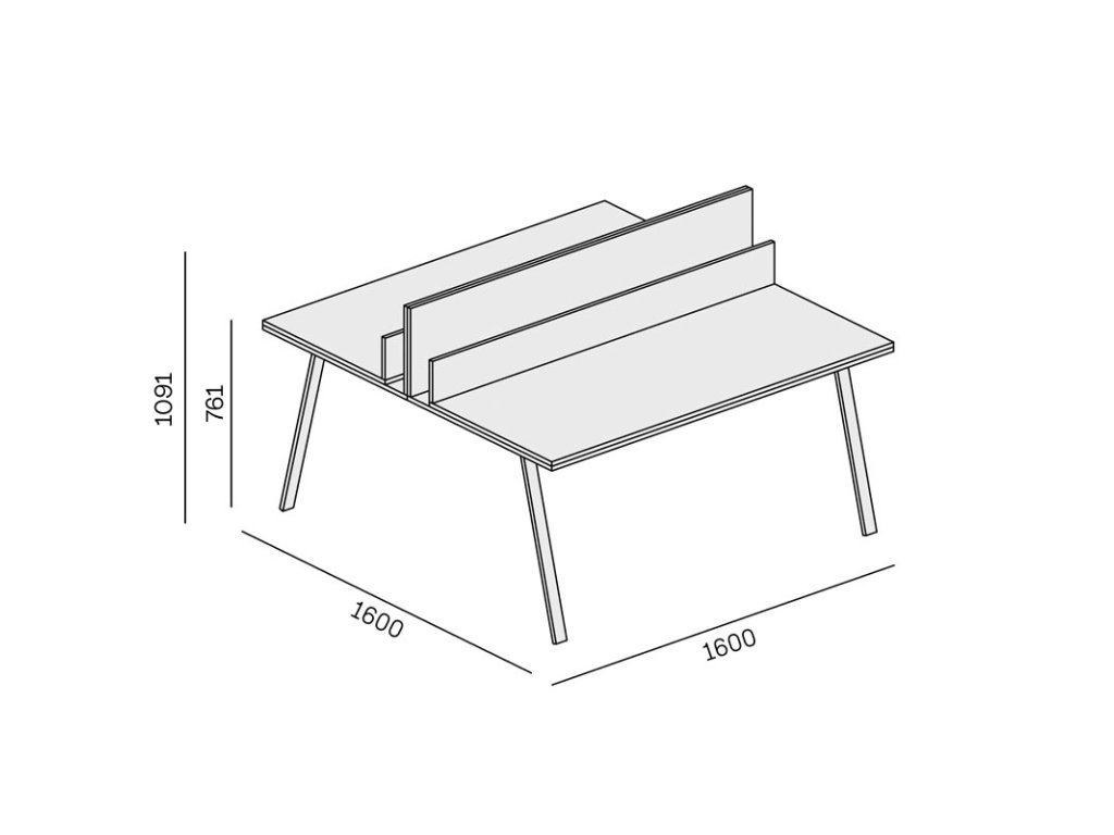 Psací stoly DOUBLE LAYERS disponují šířkou 1600 mm a hloubkou 1600 mm, která zajišťuje optimální podmínky pro celodenní práci v kanceláři pro dva kolegy. Poskytuje oboum pracovníkům dostatek místa pro PC i kancelářské potřeby. Pracovní deska z laminované dřevotřísky je olepena 1 mm silnou ABS hranou ve stejném dekoru, což dodává celé stolní desce jednotný vzhled.