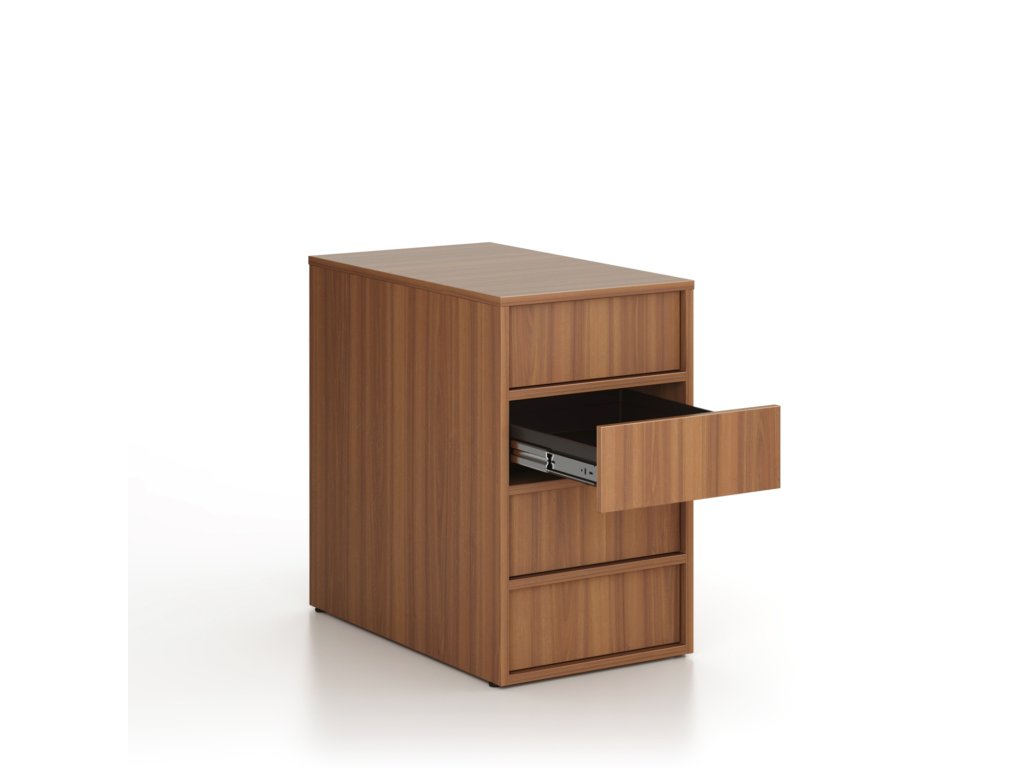 Přístavné kontejnery FRAME přidávají následně praktický úložný prostor přímo u stolu. Pevná konstrukce z laminované dřevotřísky s ABS hranou zaručuje odolnost i dlouhou životnost. Zásuvky s tichým kuličkovým 90% pojezdem a PUSH systémem podtrhují minimalistický, bezúchytkový vzhled kolekce.
