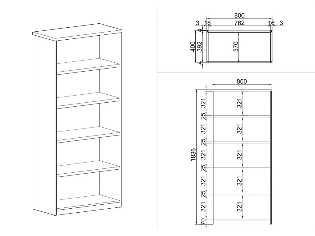 - horní půda i police jsou vyrobeny z laminované dřevotřísky o tloušťce 25 mm, korpus z lamina o tloušťce 16 mm