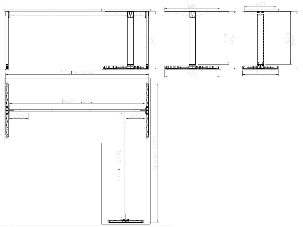 Rohovým kancelářským psacím stolům BETA L dominují 3 robustní kovové nohy z ocelových profilů ve tvaru obráceného písmene T. Podnož tohoto typu nejen, že díky rovnoměrnému rozložení hmotnosti ve spodní části zvyšuje pevnost a stabilitu stolu, ale svým minimalistickým provedením působí odlehčeným a vzdušným dojmem. Nosnost stolu činí až 120 kg.