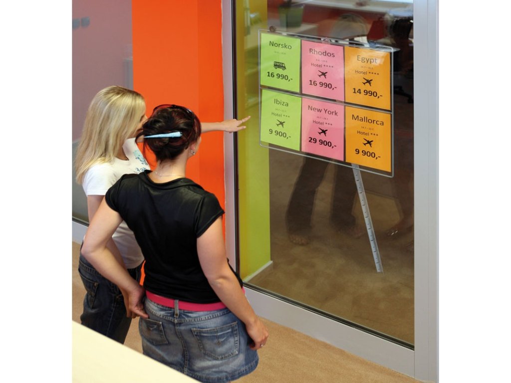 - letáky se snadno zasouvají do kapes z čirého plastu ve tvaru V