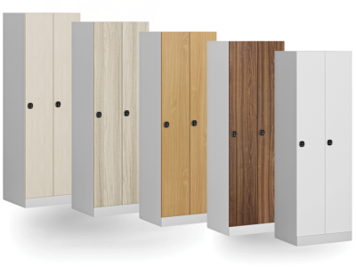 Konstrukce šatní skříňky je lakovaná kvalitním práškovým lakem vždy v odstínu RAL 7035 (šedá). Lak vytváří odolnou, stálobarevnou ochranu proti korozi, odření a usnadňuje údržbu. Standardizovaná barva RAL zajistí, že při opakovaných nákupech nakoupíte vždy stejný odstín. Dveře z laminované dřevotřísky lze vybírat v oblíbených dekorech dřeva i moderních barvách pro snadné sladění s interiérem.