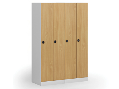 Kovová šatní skříňka s laminovanými dveřmi představuje elegantní kompromis - spojuje maximální odolnost ocelové konstrukce (0,6 mm) s reprezentativností dřeva.
