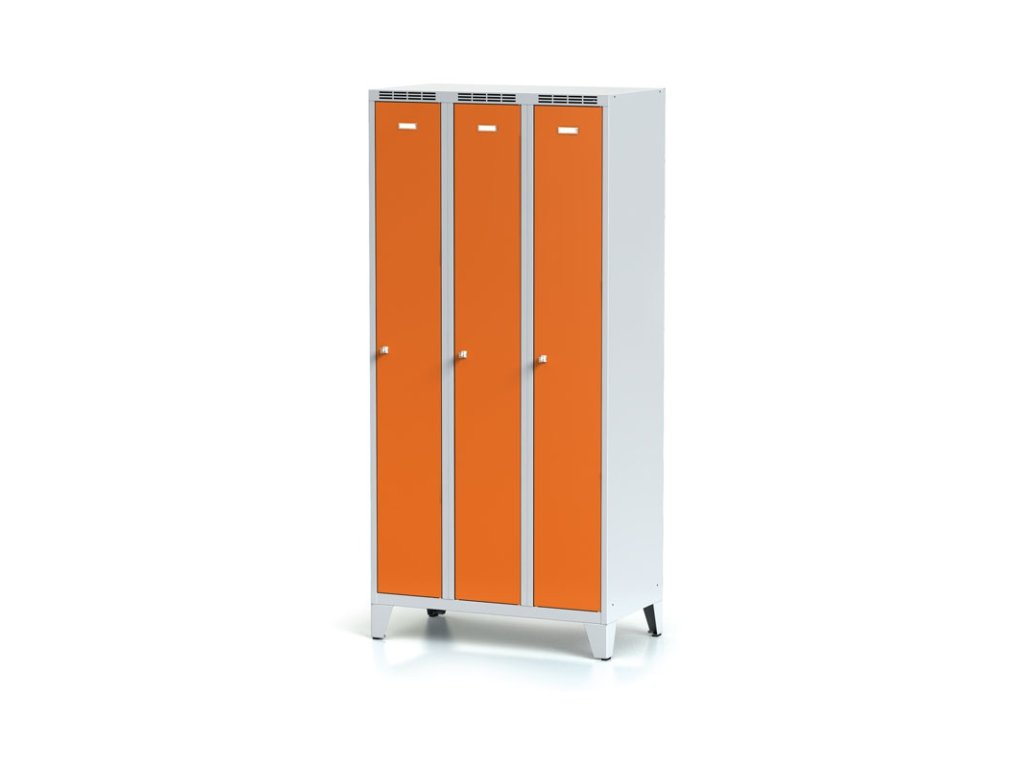 Kovová šatní skříňka S6 na nohách, 3 oddíly, 1920 x 900 x 500 mm, otočný zámek, oranžové dveře
