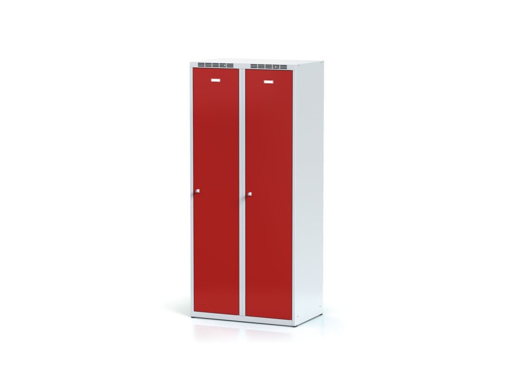 Kovová šatní skříňka s mezistěnou, 2 oddíly, 1800 x 800 x 500 mm, cylindrický zámek, červené dveře