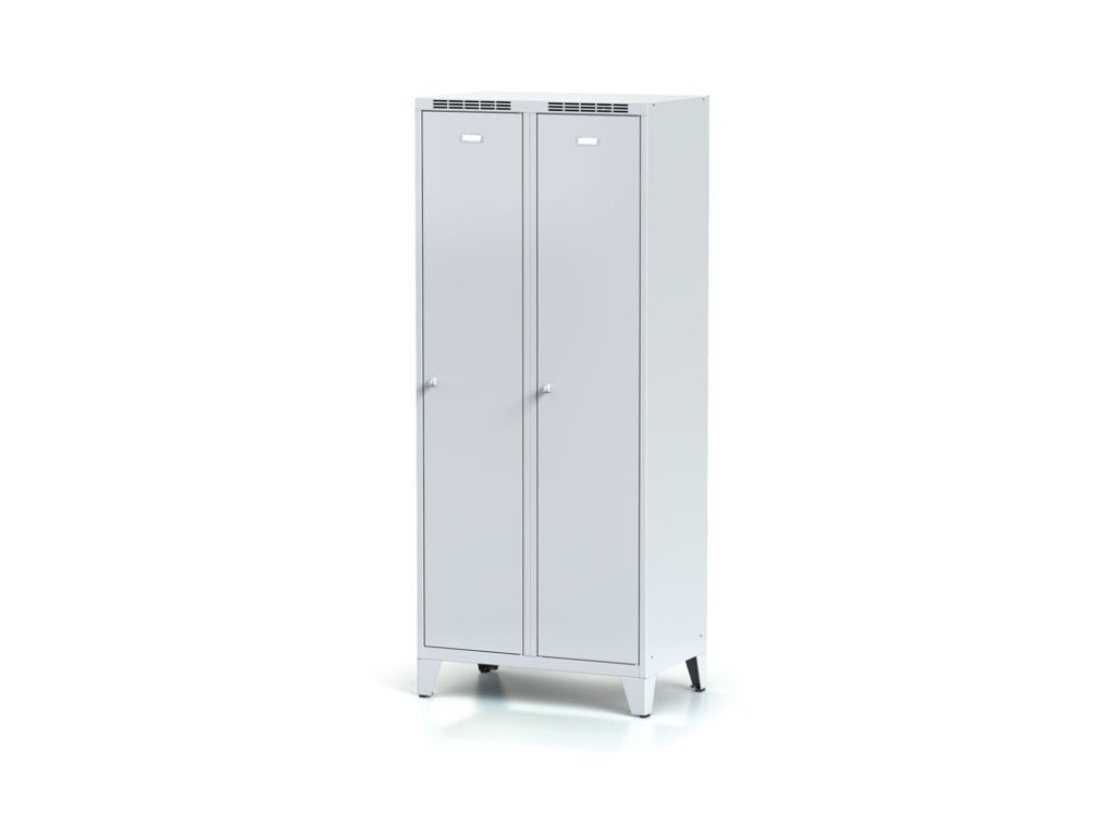 Kovová šatní skříňka S6 s mezistěnou na nohách, 2 oddíly, 1920 x 800 x 500 mm, otočný zámek, šedé dveře