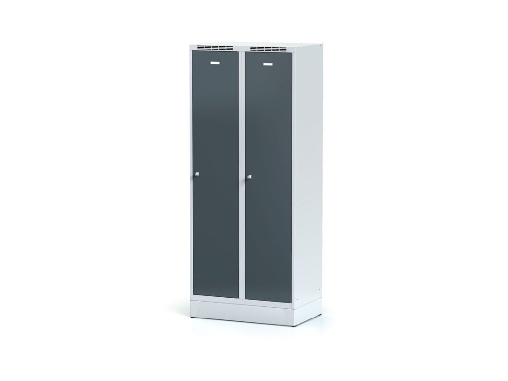 Kovová šatní skříňka S6 s mezistěnou na soklu, 2 oddíly, 1920 x 800 x 500 mm, otočný zámek, tmavě šedé dveře