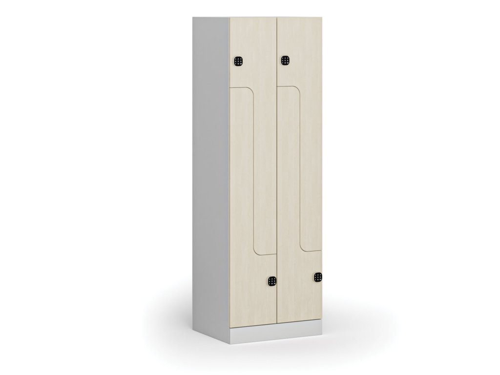 Skříňka typu Z chytře rozděluje prostor jednoho oddílu (šířka 300 mm) na horní a dolní část, přičemž každá slouží jako samostatně uzamykatelný úložný prostor. Skříňka se Z dveřmi je ideální pro 2 osoby nebo jako alternativa k širokým skříňkám s mezistěnou, kde lze oddělit civilní a pracovní oděv. Oproti klasickým skříňkám je však potřeba u skříňky Z počítat s o něco nižší výškou pro zavěšení oděvů – cca 1000 mm.