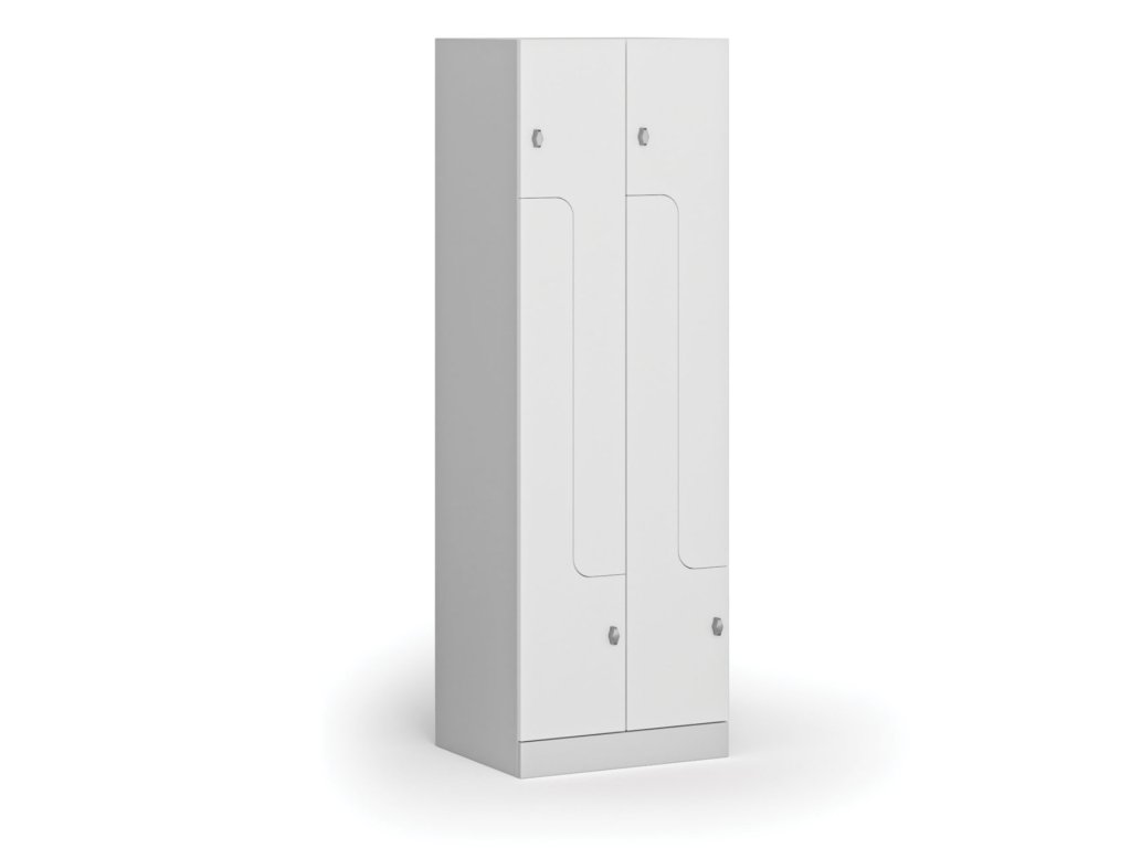 Skříňka typu Z chytře rozděluje prostor jednoho oddílu (šířka 300 mm) na horní a dolní část, přičemž každá slouží jako samostatně uzamykatelný úložný prostor. Skříňka se Z dveřmi je ideální pro 2 osoby nebo jako alternativa k širokým skříňkám s mezistěnou, kde lze oddělit civilní a pracovní oděv. Oproti klasickým skříňkám je však potřeba u skříňky Z počítat s o něco nižší výškou pro zavěšení oděvů – cca 1000 mm.