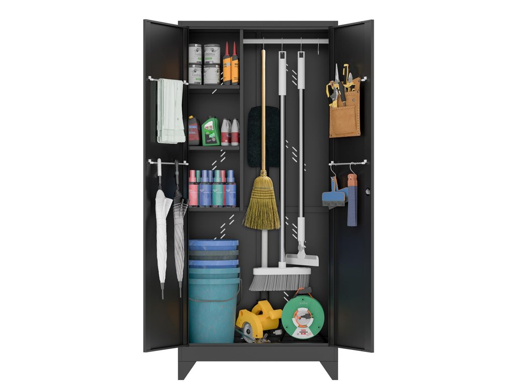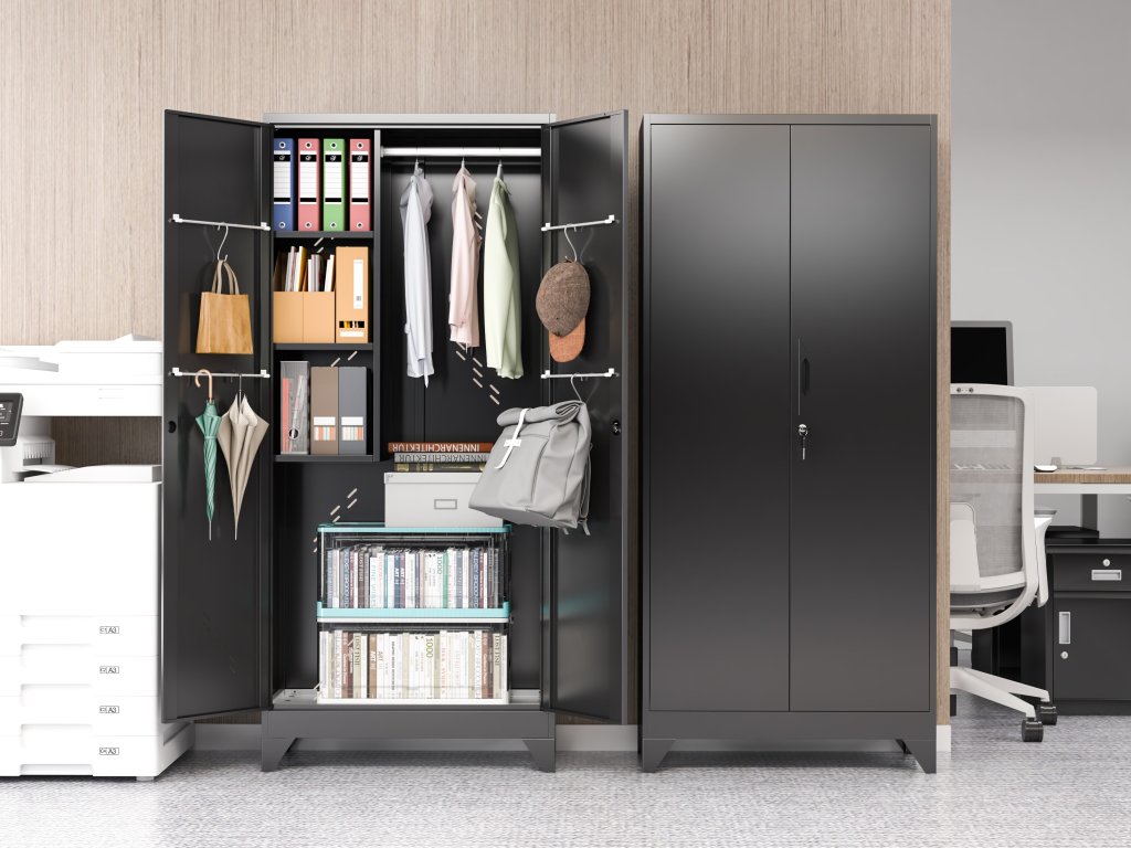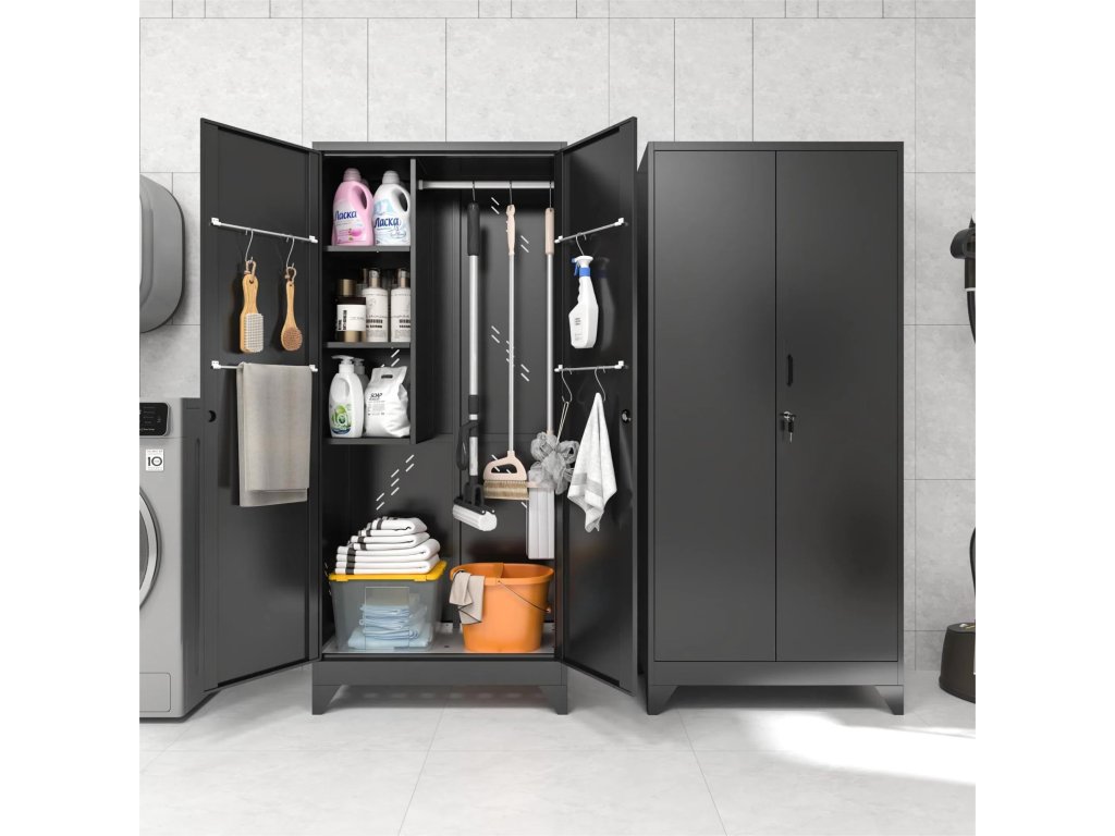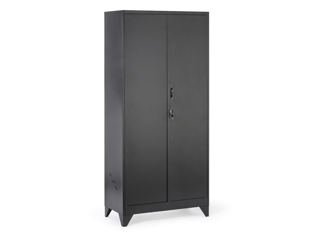 Kovová skříň v elegantním černém provedení nabízí praktické a hygienické řešení pro ukládání oděvů i osobních věcí. Díky promyšlenému vnitřnímu vybavení, integrovanému větrání a pevné konstrukci s vyztuženými křídlovými dveřmi je ideální volbou do šaten, zázemí firem, výroby i sportovišť. Stabilitu skříně doplňují 10 cm nožičky, které usnadňují úklid pod skříní.