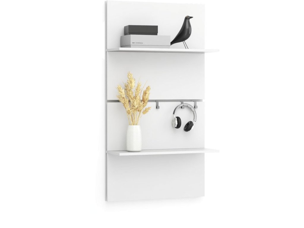 Pro zavěšení kabátů určitě oceníte i praktické nástěnné panely, u kterých jednoduchým nasunutím polic či závěsných háčků (volitelné příslušenství) ze strany do drážky tak vytvoříte potřebný úložný prostor i šatní stěnu, která zabere minimum místa.