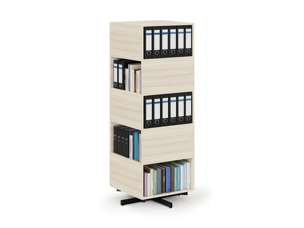 Tento otočný regál je praktickým řešením pro přehledné ukládání šanonů, knih nebo kancelářských potřeb. Díky otočné konstrukci se snadno dostanete ke všem uloženým věcem bez nutnosti regál obcházet – ideální volba pro kanceláře, archivy a kartotéky.