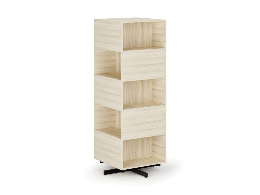 Regál má celkem 10 otevřených oddílů. Každý oddíl je navržen tak, aby pohodlně pojmul i standardní kancelářský šanon. Otočný systém je ukotven na robustní černé kovové základně s ložiskem, která zajišťuje stabilitu a plynulé otáčení.