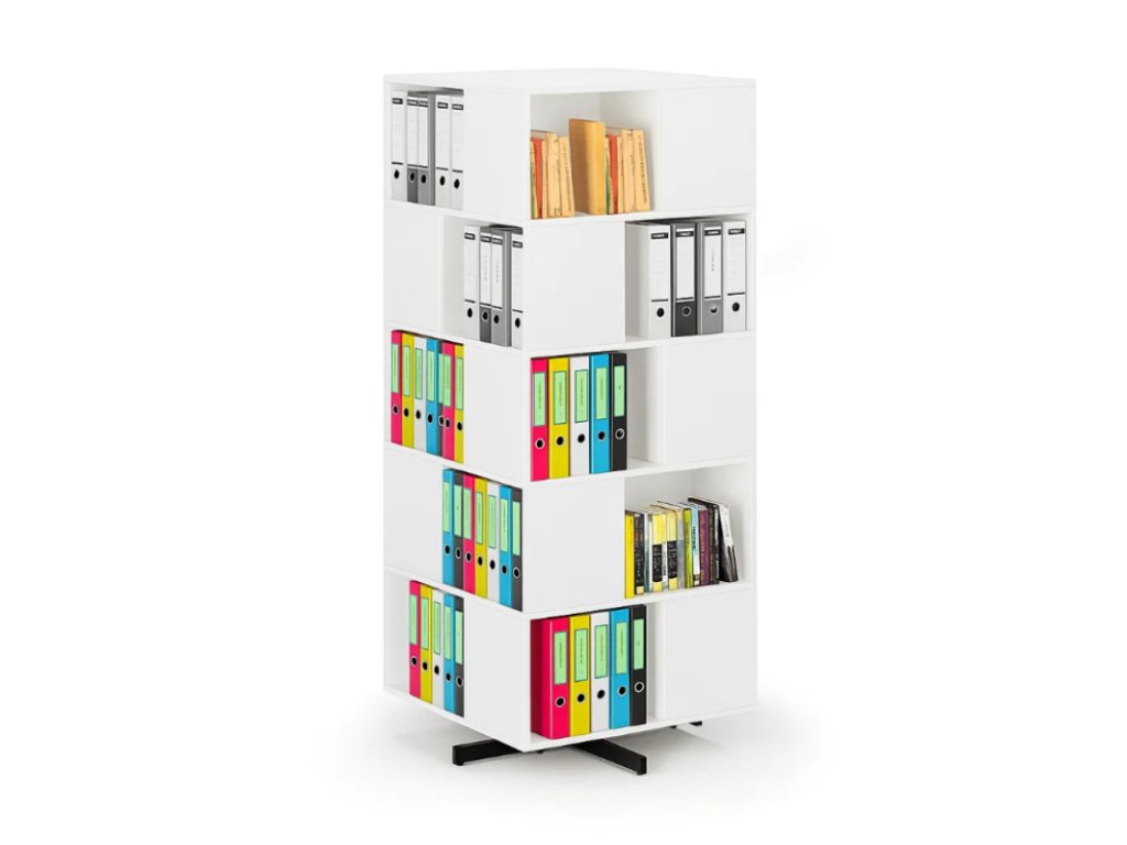 Tento otočný regál je praktickým řešením pro přehledné ukládání šanonů, knih nebo kancelářských potřeb. Díky otočné konstrukci se snadno dostanete ke všem uloženým věcem bez nutnosti regál obcházet – ideální volba pro kanceláře, archivy a kartotéky.