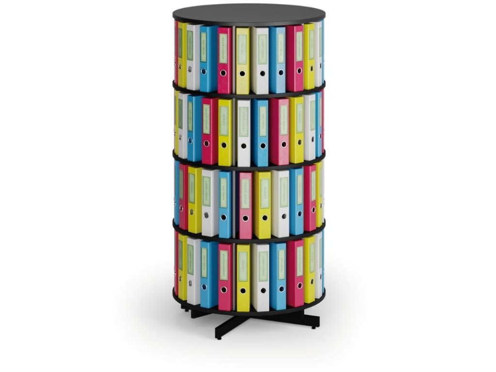 Archivační systém, který Vám ušetří prostor při archivaci Vašich písemností. Díky otočnému mechanismu lze uspořádat až 144 pořadačů, otočný sloup si vyžádá jen asi 1 m2 pro jeho umístění a pro vlastní přístup k pořadačům. Při běžném použití archivační skříně, nebo regálů na pořadače potřebujete prostor cca 2 m2. Výhoda úspory místa při použití otočných archivačních sloupů se zvyšuje úměrně s počtem instalovaných sloupů, například při použití dvou sloupů je již úspora místa 1,5 m2. Otočná skříň je posazena na otočný kříž, velmi lehké otáčení zajišťují ložiska umístěná přímo v otočném stojanu vybaveném stavěcími šrouby, které slouží k vyrovnání možných nerovností podlahy. Konstrukce skříně je samonosná, zajišťující velmi dobrou pevnost a stabilitu. Patra skříně jsou z laminované dřevotřísky s plastovu hranou zabraňujcí samovolnému vysunutí pořadače mimo obvod skříně. Patro je možno otočit, čímž vznikne deska bez hran zabraňující samovolnému vysunutí pořadačů. Kapacita jednoho patra je 24 pořadačů. Patro tvoří kruhová laminová deska o průměru 80 cm. Všechna patra se otáčejí najednou. Lze vytvořit až šestipatrouvou archivační otočnou skříň. Standardní barevné provedení je v šedé a černé barvě. Pořadače na fotografiích nejsou součástí dodávky. Skříň je dodávána v kartonu s návodem k jednoduché montáži.