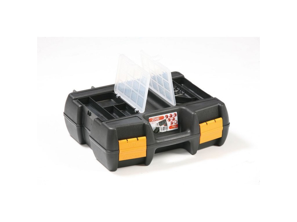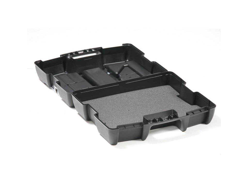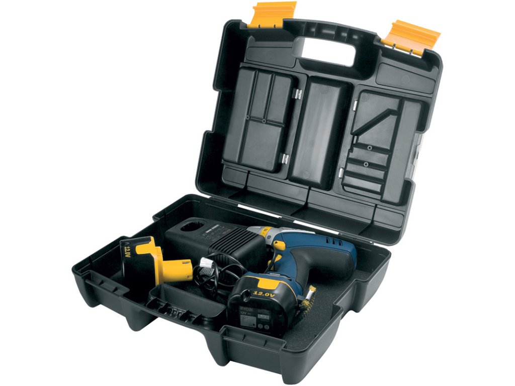 - zásobníky na spojovací materiál a vrtáky na vnější straně víka