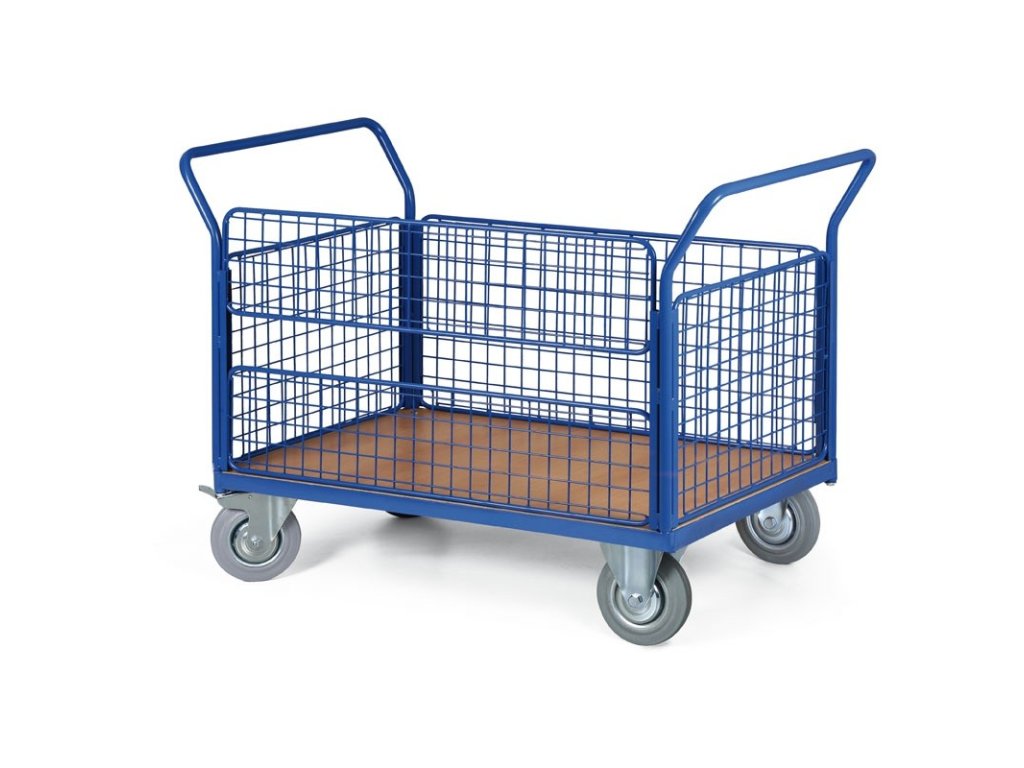 Plošinový vozík s drátěnými výplněmi, 1000x700 mm, nosnost 300 kg, kola 160 mm s šedou pryží