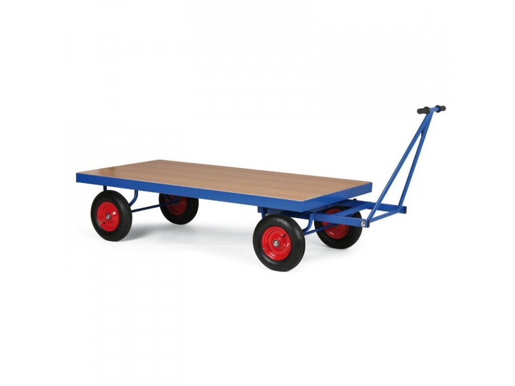 Tyto ruční plošinové vozíky jsou výborným pomocníkem všude tam, kde je potřeba převážet materiál či zboží velkých rozměrů a vysokých nosností na kratší vzdálenosti. . Multifunkční ruční plošinové vozy umožňující stavbu variant dle přání zákazníka pouhým zasunutím požadované nádstavby a zajištění šroubem. Speciální uložení bočnic zajišťuje vždy výbornou pevnost a stabilitu vozů. Ložná plocha je svařena z ocelových trubek a profilů. Kovové části jsou nakomaxitovány práškovým lakem RAL 5005. Dle přání našeho zákazníka lze zajistit taktéž jiný odstín RAL. Ložná plocha a dřevěné výplně jsou vyrobeny z laminované dřevotřísky se vzorem světlý buk. Vozík je lehce ovladatelný, velmi dobrá manipulace na malém prostoru je zajištěna plným otočením řídící nápravy o 90°. Typ kol umožňuje rychlost vozu do 4 km/h.