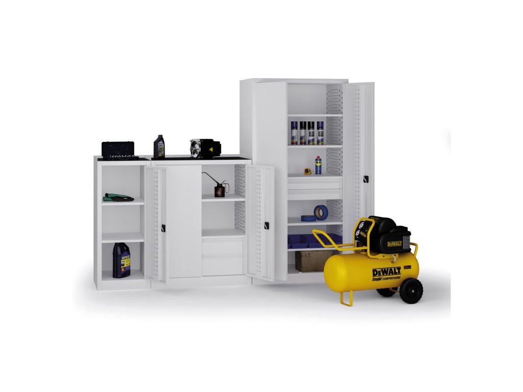 - Dveře s perforovanou výztuhou - Tloušťka plechu dveří 1mm, vnitřní perforace pro zavěšení držáků nářadí
