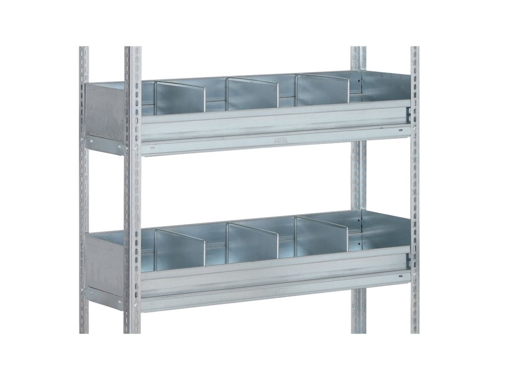 Vhodná pro skladování drobných součástek a materiálu v regálech FIX a CLIP. Balení obsahuje 2 ks podélných a bočních stěn. Výška přední stěny 75 mm, výška zadní a boční stěny 150 mm.