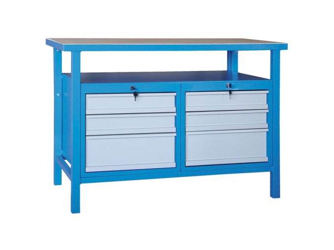 Dílenský pracovní stůl GD, smrk + buková překližka, 6 zásuvek, 1190 x 600 x 850 mm, modrá
