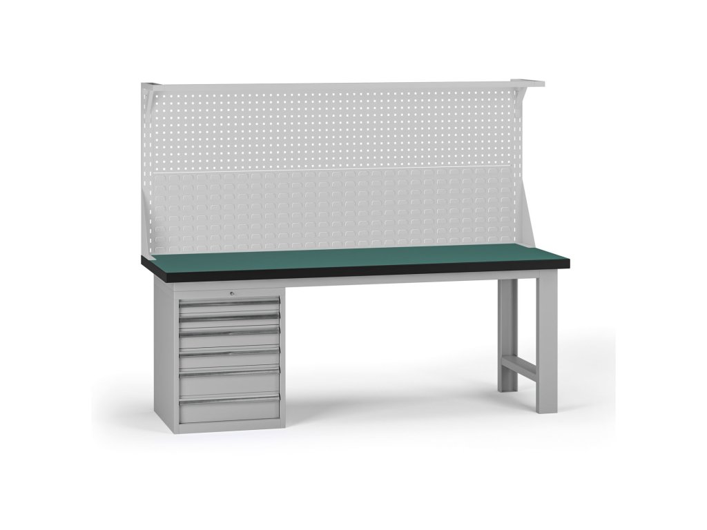 Pracovní stůl do dílny G8 s nástavbou, 2100 x 750 x 800 mm, 1x kontejner, 6 zásuvek, šedá