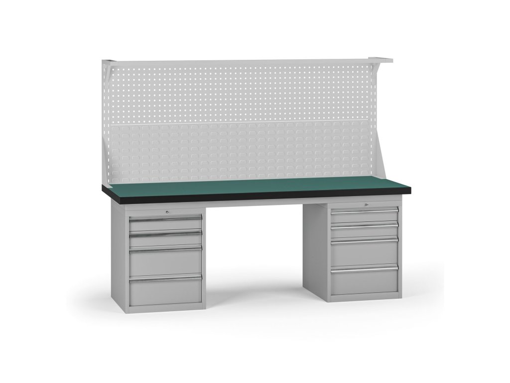 Pracovní stůl do dílny G8 s nástavbou, 2100 x 750 x 800 mm, 2x kontejner, 8 zásuvek, šedá