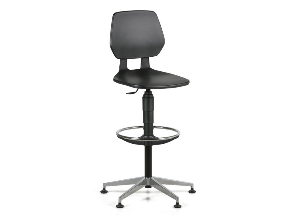 Tato pracovní židle je vybavena opěrným kruhem, který slouží jako opora pro nohy u zvýšených pracovních židlí a stoliček a zajišťuje tak potřebný komfort i při dlouhodobém sezení.