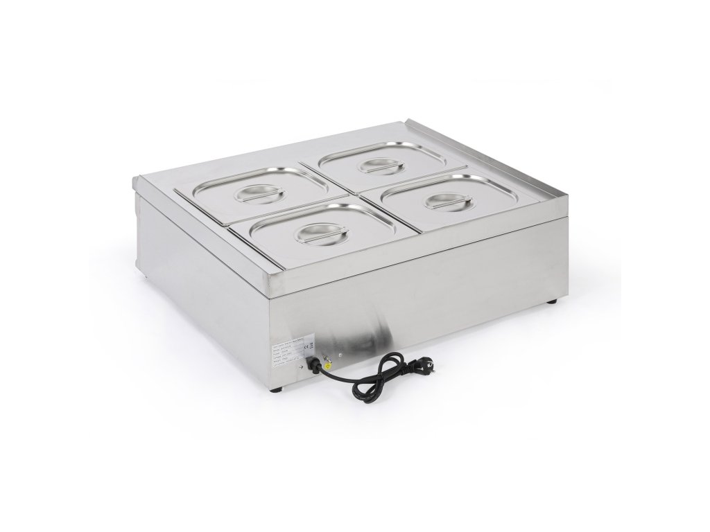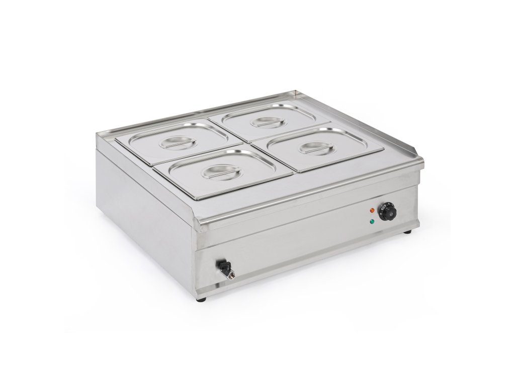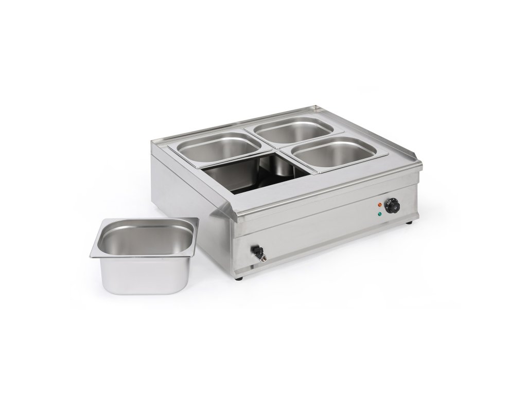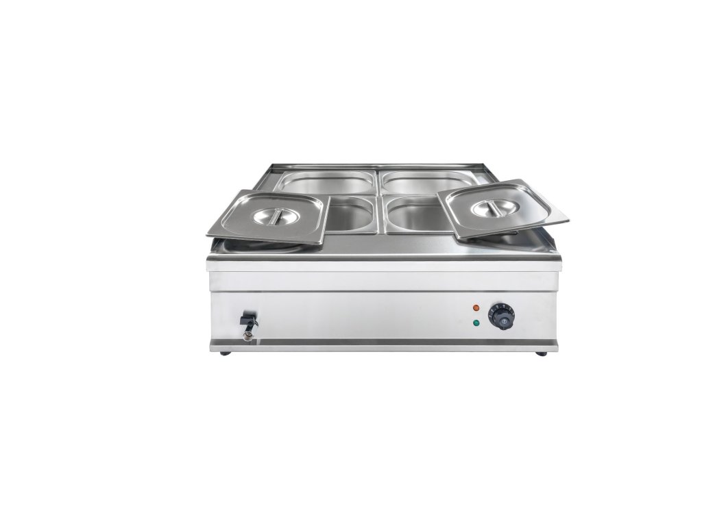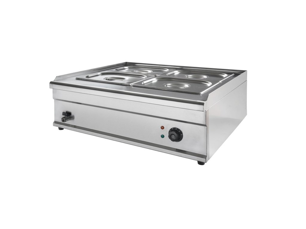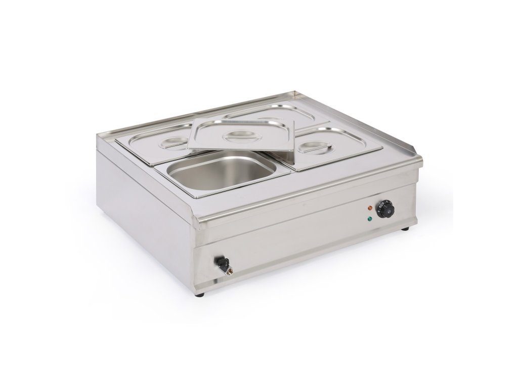 Zařízení je vybaveno čtyřmi GN nádobami velikosti 1/2 o hloubce 150 mm včetně vík, které umožňují udržovat teplé omáčky, přílohy i hlavní jídla odděleně. Výpust s kohoutkem je umístěn na čelní straně a přečnívá z těla zařízení o 0,7 mm. Díky plynule nastavitelnému termostatu v rozsahu 30–80 °C si obsluha snadno přizpůsobí teplotu podle potřeby.